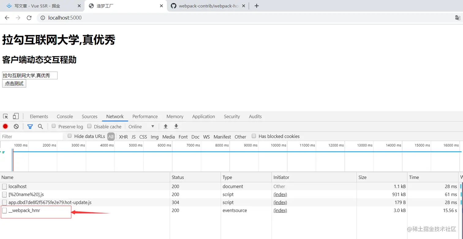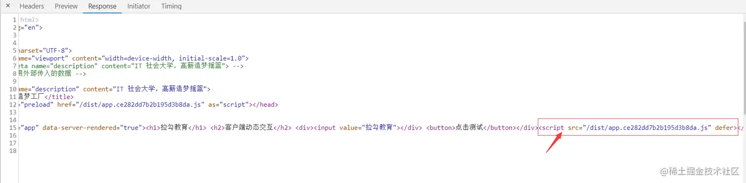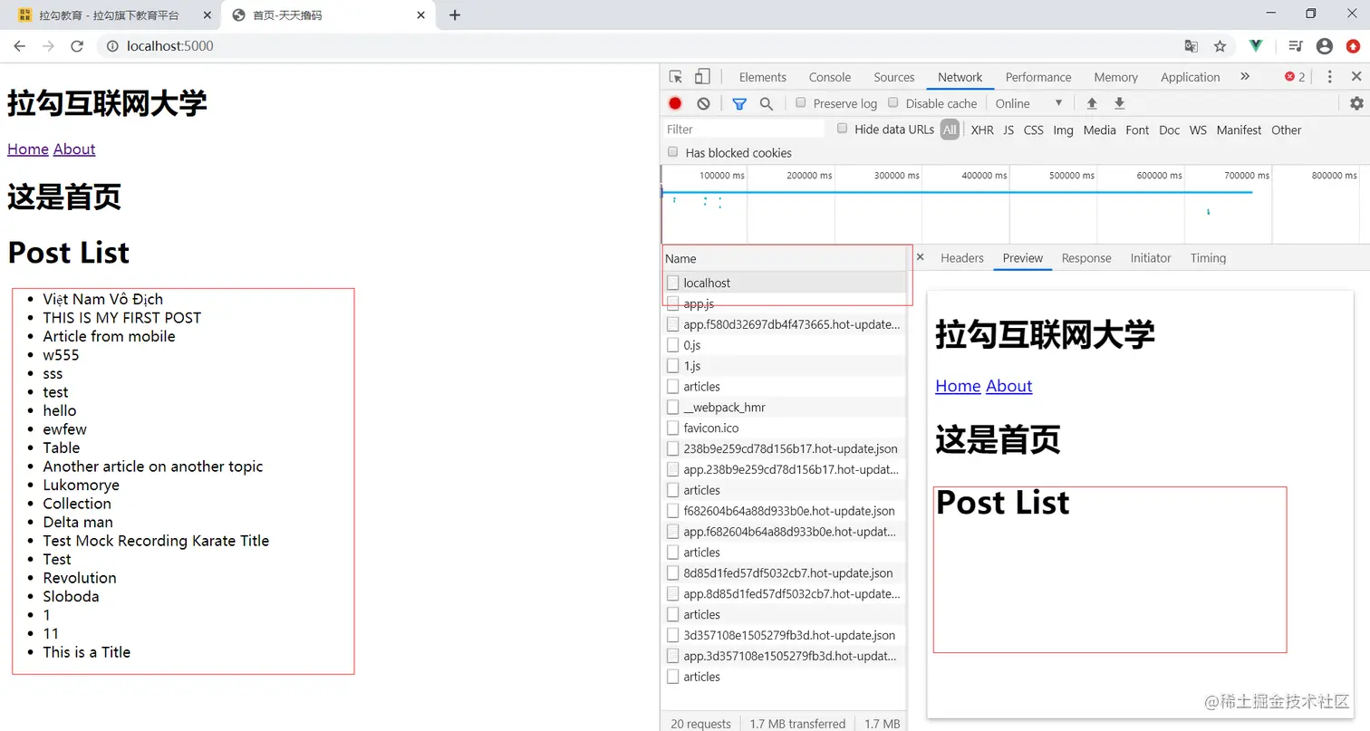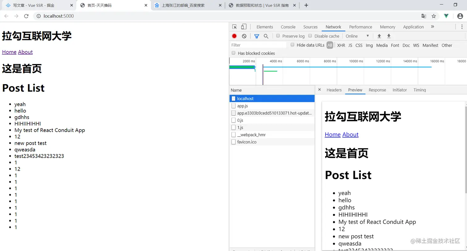 从结果中可以看到,虽然渲染出了文章列表了,但是在服务端返回的数据中,并没有文章的列表,页面上的文章列表的数据是客户端渲染出来的