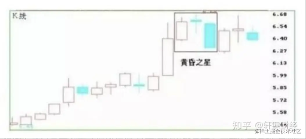黄昏之星的情况同早晨之星正好相反,她是较强烈的上升趋势中出现反转的信号。黄昏之星的K线组合形态如果出现在上升趋势中应引起注意,因为此时趋势已发出比较明确的反转信号或中短期的回调信号,对于我们来说可能是非常好的卖入时机或中短线回避的时机。同时如能结合成交量的研判,对于提高判断的准确性有更好的帮助。