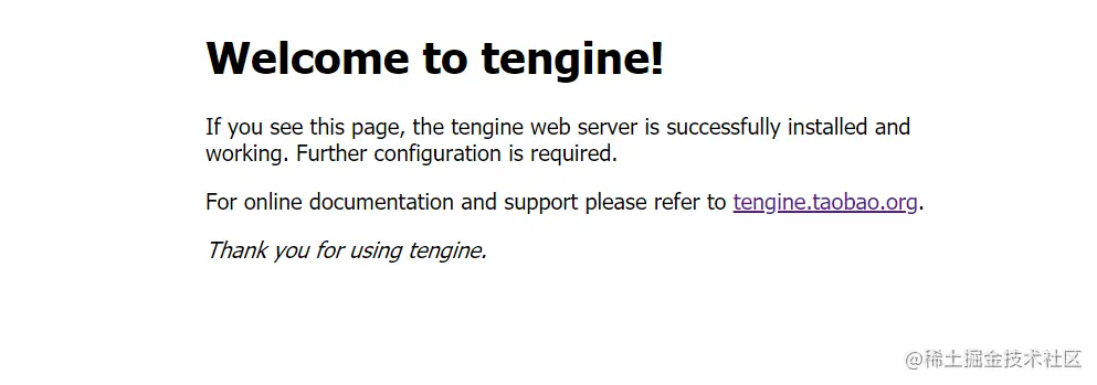 在虚拟机浏览器中输入127.0.0.1或在虚拟机联网情况下直接在本机浏览器输入虚拟机ip,如果可以看到如下画面,则Tengine安装成功。