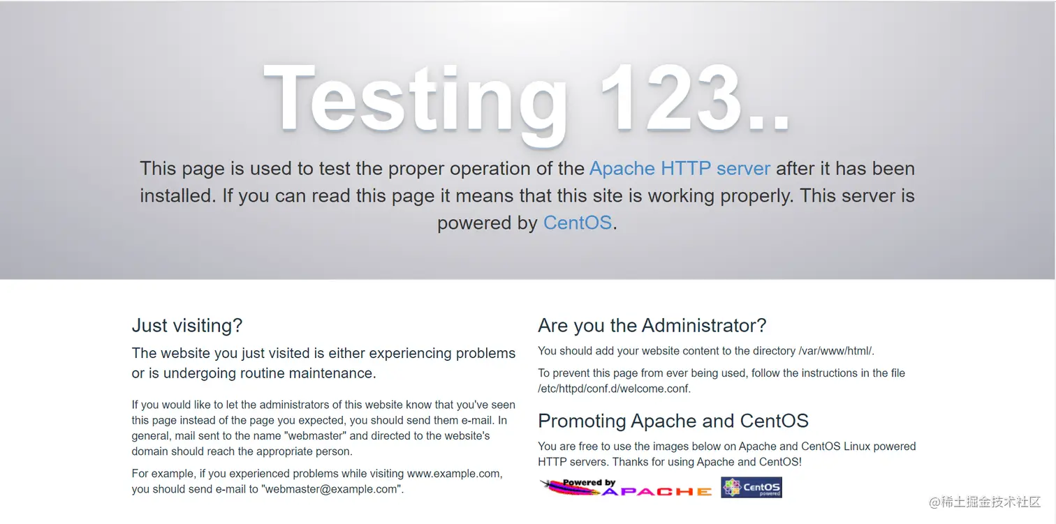 在虚拟机浏览器中输入127.0.0.1或在虚拟机联网情况下直接在本机浏览器输入虚拟机ip,如果可以看到如下画面,则Apache安装成功。