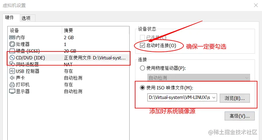 2.1.2 开机之前请确保已经将虚拟机设置-->CD/DVD按下图设置成功