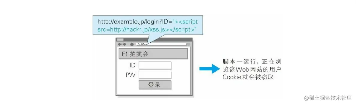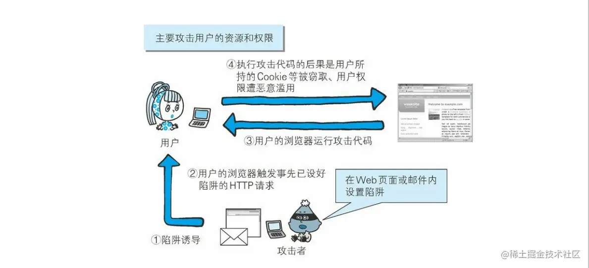 - 利用脚本窃取用户的 Cookie 值,被害者在不知情的情况下, 帮助攻击者发送恶意请求。