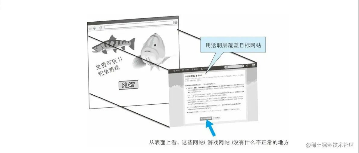 点击劫持(Clickjacking)是指利用透明的按钮或链接做成陷阱,覆盖在 Web 页面之上。然后诱使用户在不知情的情况下,点击那个链接 访问内容的一种攻击手段。这种行为又称为界面伪装(UI Redressing)。