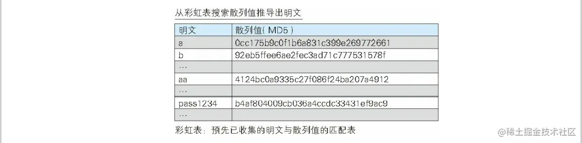 彩虹表(Rainbow Table)是由明文密码及与之对应的散列值构成 的一张数据库表,是一种通过事先制作庞大的彩虹表,可在穷举法或字典攻击等实际破解过程中缩短消耗时间的技巧。
