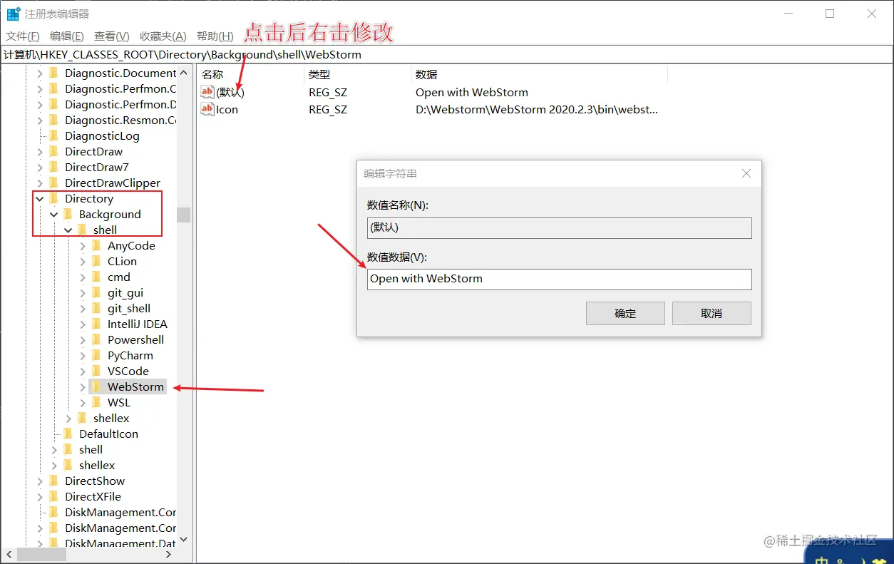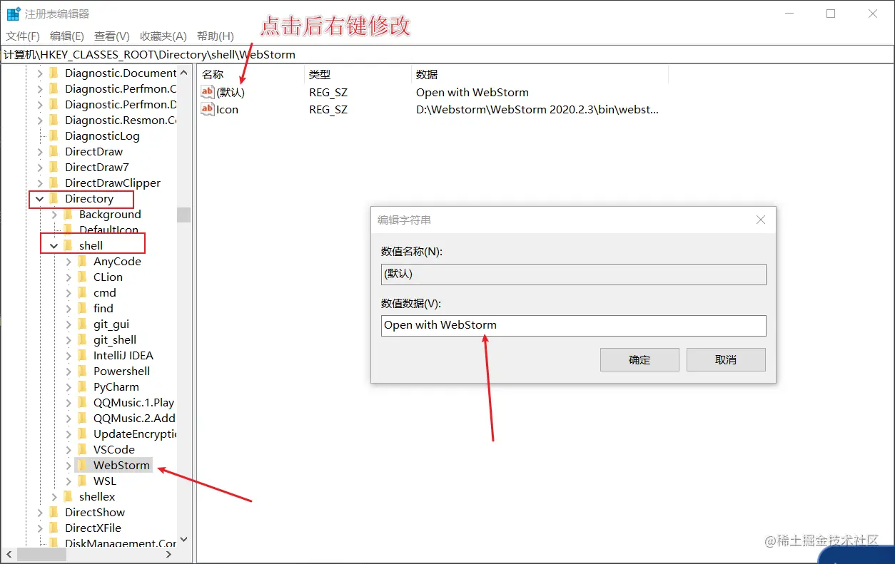 「win10右键菜单修改名称」 不知名网友小H 2020-12-06 1,021 阅读1分钟 前言 纯粹个人习惯,不喜欢太长,太大的右键菜单。希望能帮助有同样困扰的你们。 步骤 1、使用命令:win+R,显示如下界面 2、输入命令:regedit,允许权限并进入注册表页面 3、找对路径:计算机\HKEY_CLASSES_ROOT\Directory 4、修改桌面鼠标右击后的菜单名称,自行选择修改另外的软件的名字 5、修改文件右击后的菜单名称,自行选择修改另外的软件的名字 修改后的展示 1、桌面的右键菜单 2、文件的右键菜单