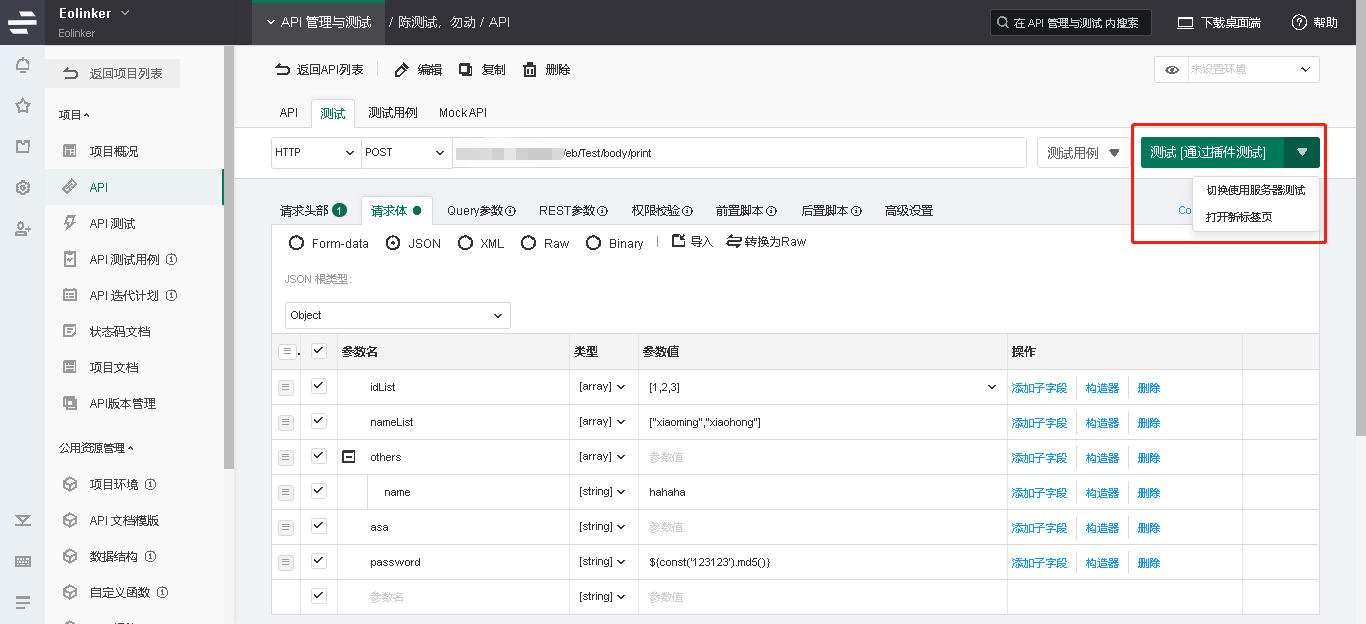 在测试界面可对api请求参数进行处理,例如希望对password进行md5加密。