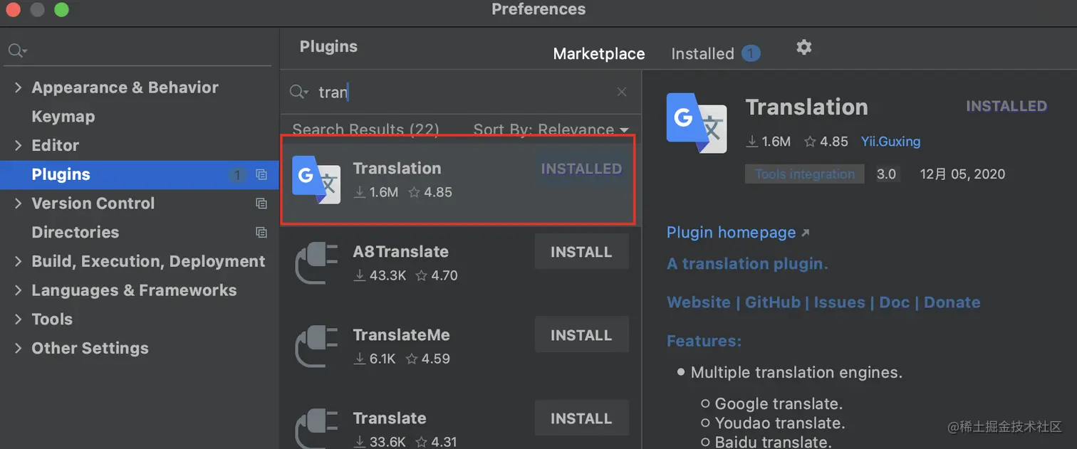 - 打开webstorm中的设置,选择plugins,搜索 translations 安装,安装完成重启webstorm