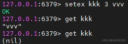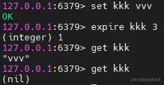 在这里我先通过set设置了一个键值对,然后通过expire操作为kkk这个键设置了三秒的过期时间,三秒之内可以查询到结果,但是三秒之后就查询不到了