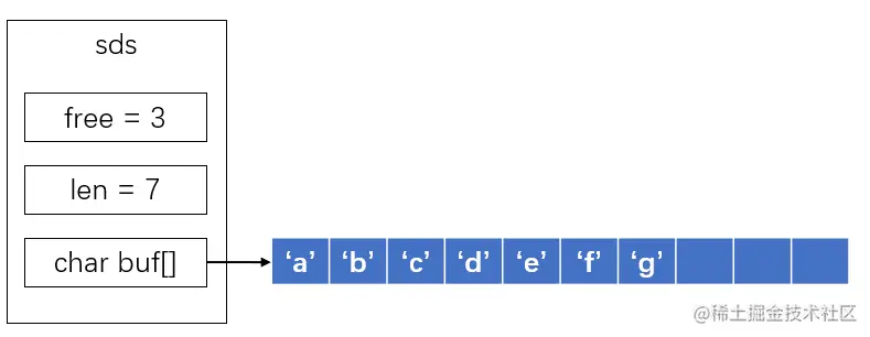 Redis中String类型是实现依赖于一种名为sds的自定义结构,sds中包含了free(当前可用空间大小),len(当前存储字符串长度),buf[] (存储的字符串内容),下面是sds的源码实现