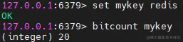 redis这个字符串的二进制表示为01110010 01100101 01100100 01101001 01110011,一共有20个1,通过bitcount就可以将其统计出来