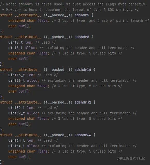 其实在源码中sds结构中共分为五个细分类型。之所以有5种,是为了能让不同长度的字符串可以使用不同大小的header。我们可以看到不同sds中len和alloc(free)的类型是不一样的,他们也对应着不同的长度,而结构体中的flags字段就记录着header的类型。通过对不同长度的字符串分配范围不同的长度,从而最大化的节省空间,可见Redis团队对性能的极致追求。