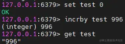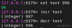 在Redis的字符串中,如果字符串中的字符全是整数,则可以对这个“字符串”(其实是个整数啦)进行简单的自增自减操作,自增自减操作的命令是incr和decr,我们可以看到下图中我们给test赋值为996,对他的自增自减操作可以成功