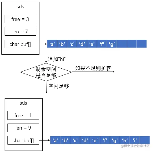 我们知道Redis是一种直接使用内存的数据库,数据保存在内存当中,当我们对一个字符串类型进行追加的时候,可能会发生两种情况:①当前剩余空间(free)足够容纳追加内容时,我们就不需要再去分配内存空间,这样可以减少内存分配次数。②当前剩余空间不足以容纳追加内容,我们需要重新为其申请内存空间。