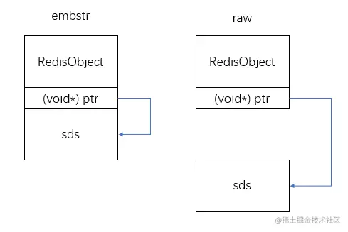 上面的SDS只是字符串类型中存储字符串内容的结构,Redis中的字符串分为两种存储方式,分别是embstr和raw,当字符串长度特别短的时候,Redis使用embstr来存储字符串,而当字符串长度超过44的时候,就需要用raw来存储,下面是他们的字符串完整结构的示意图
