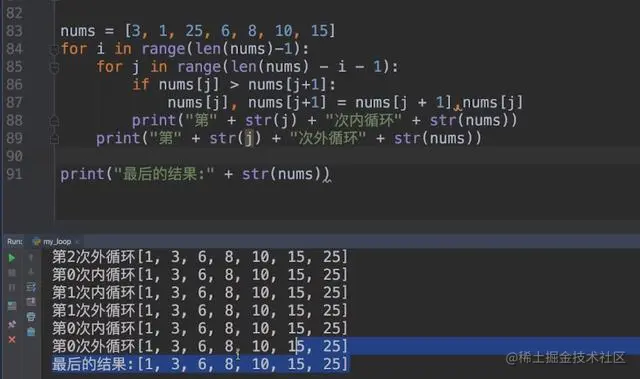 我们先遍历nums,这不就是我们的range(len(nums)-1),至于为什么是range(len(nums)-1),其实就是我们的下标从0开始的,len(nums)返回是7,range是左开右闭,但是冒泡排序,我们只需要取到nums[5] = 10 就足够了,所以这里range(len(nums)-1),取到[3,1,25,6,8,10]。