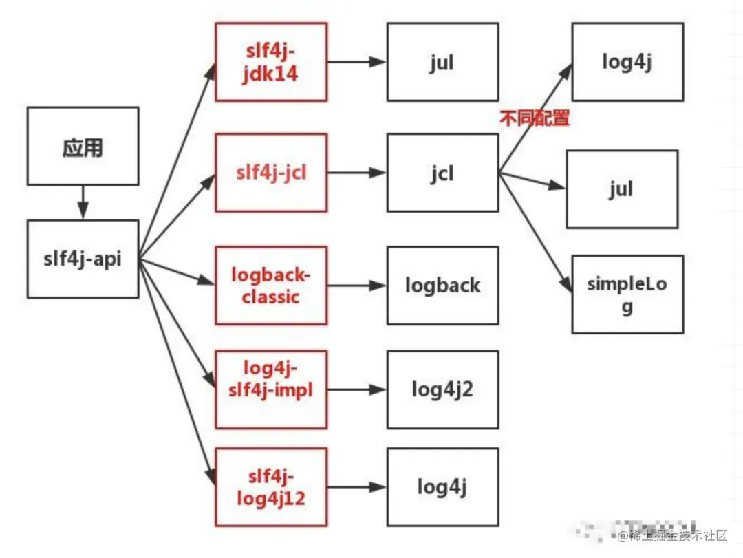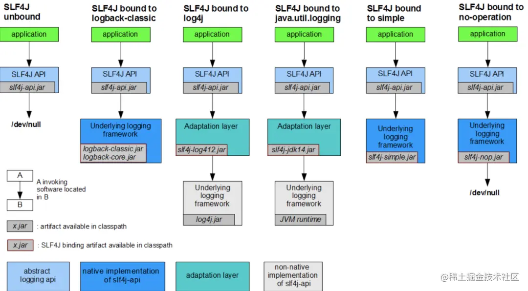 因为当时Java的日志组件比较混乱繁杂,Ceki Gülcü推出slf4j后,也相应为行业中各个主流日志组件推出了slf4j的适配 图来源于官方文档
