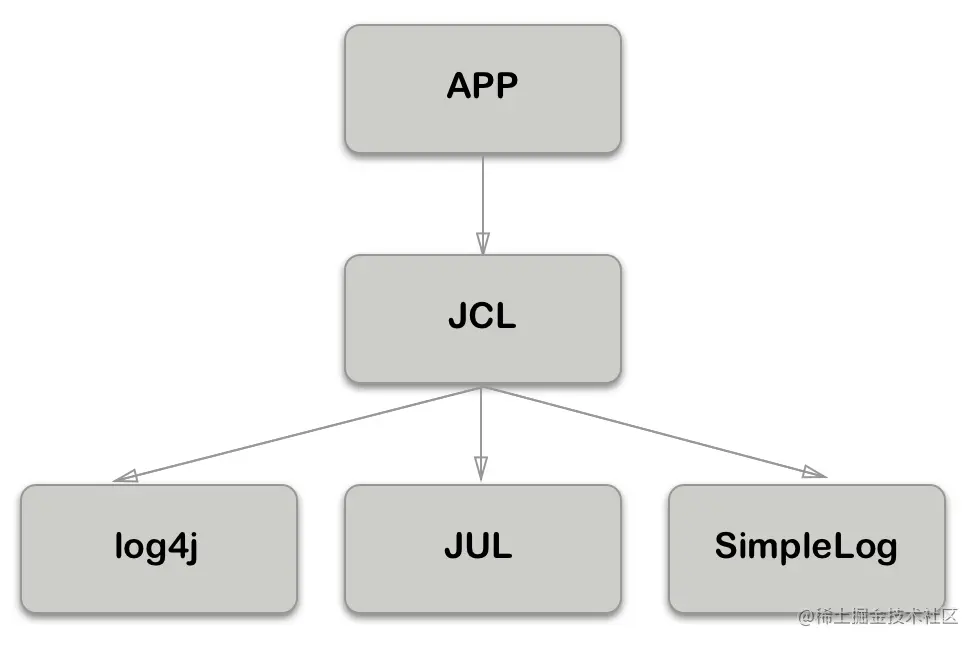 Apache见此,开发了JCL(Jakarta Commons Logging),即commons-logging-xx.jar。它只提供一套通用的日志接口api,并不提供日志的实现。很好的设计原则嘛,依赖抽象而非实现。这样应用程序可以在运行时选择自己想要的日志实现组件。
