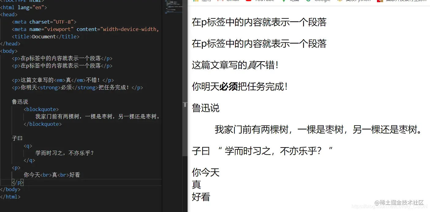 仔细观察上面的例子我们就会发现,有些标签的内容即使很短它也会自动占满一行 即使后面有很大的空白也不会写入内容,像标题标签、段落标签、长引用标签等,而有些标签的内容则不会单独占据一行,写完之后仍然和其他内容共处一行 ,例如强调标签 、短引用标签,这就是块标签和行内标签的区别。