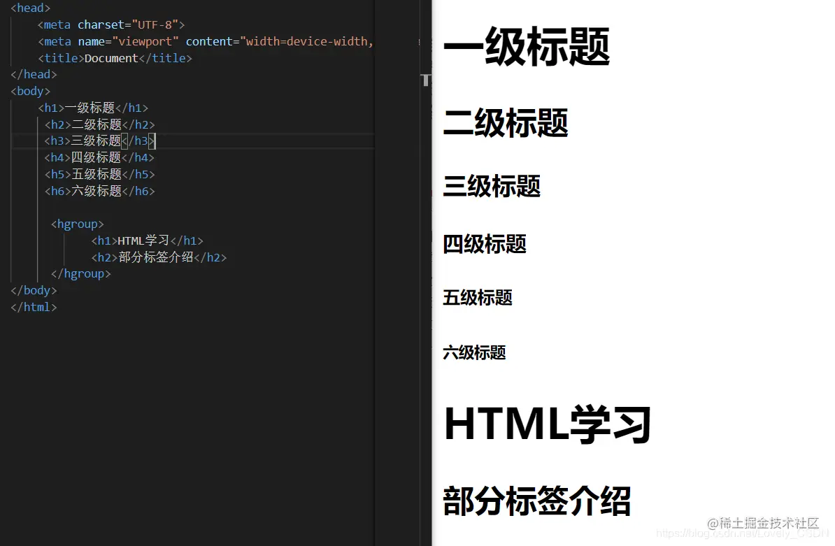 h1~h6) h1 ~ h6 一共有六级标题,从h1 ~ h6重要性递减,h1最重要,h6最不重要,h1在网页中的重要性仅次于title标签,一般情况下一个页面中只会有一个h1(搜索引擎搜索网页时,可能会通过标题来了解网页内容,因此title和h1中一般放非常重要的内容),通常情况下标题标签只会使用到h1~ h3,h4 ~ h6很少用。另外,有些情况下文章的两级标题存在关联性,例如我们的文章标题HTML学习标题下有一个副标题3.部分标签介绍。因此还存在一个标签hgroup专门为标题进行分组。不必在意样式,只关注标签语义即可。
