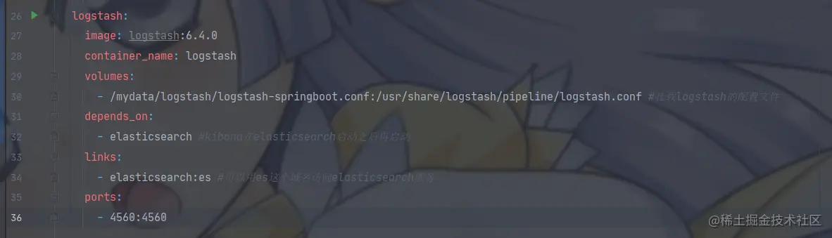 - /mydata/logstash/logstash-springboot.conf:/usr/share/logstash/pipeline/logstash.conf #挂载logstash的配置文件