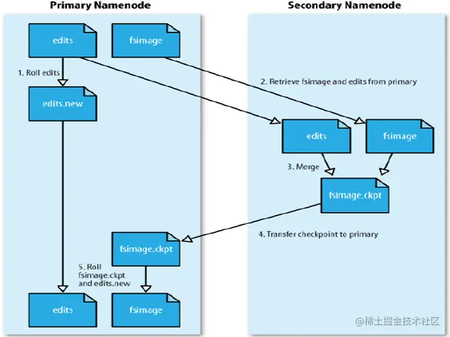 - 这个过程结束后,NameNode就有了最新的fsimage文件和更小的edits文件