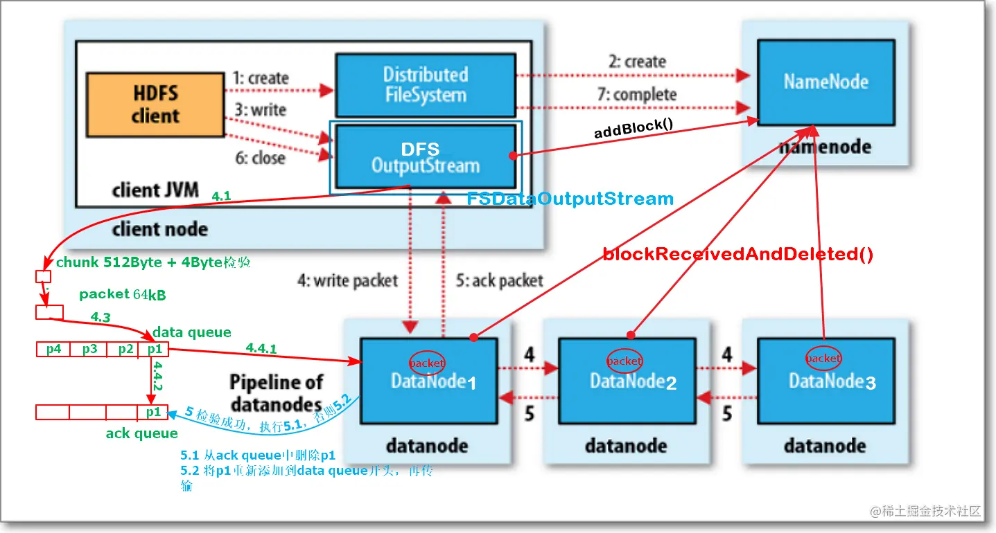 - 每个packet都会有ack确认包,逆pipeline(dn3 -> dn2 -> dn1)传回输出流