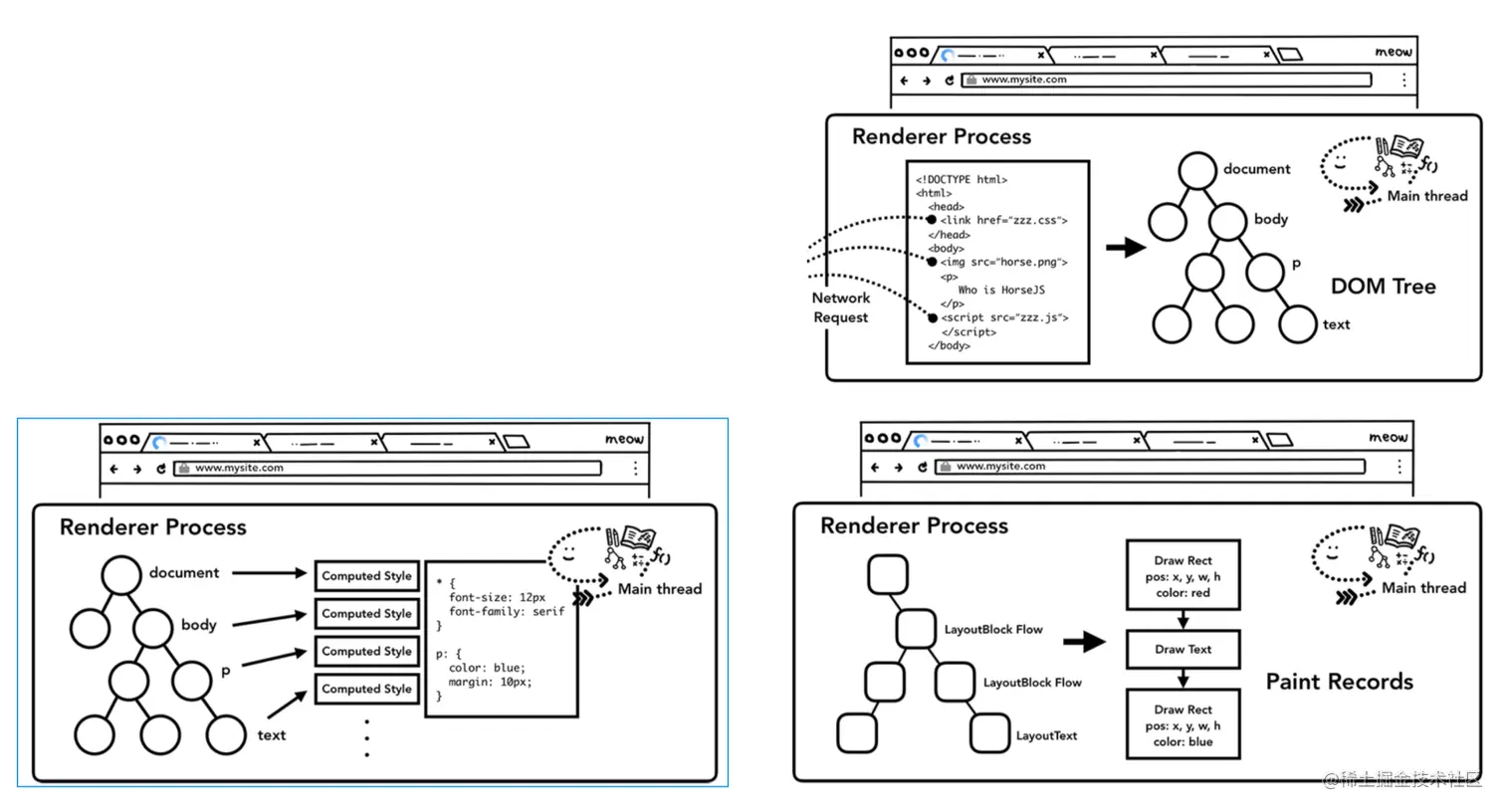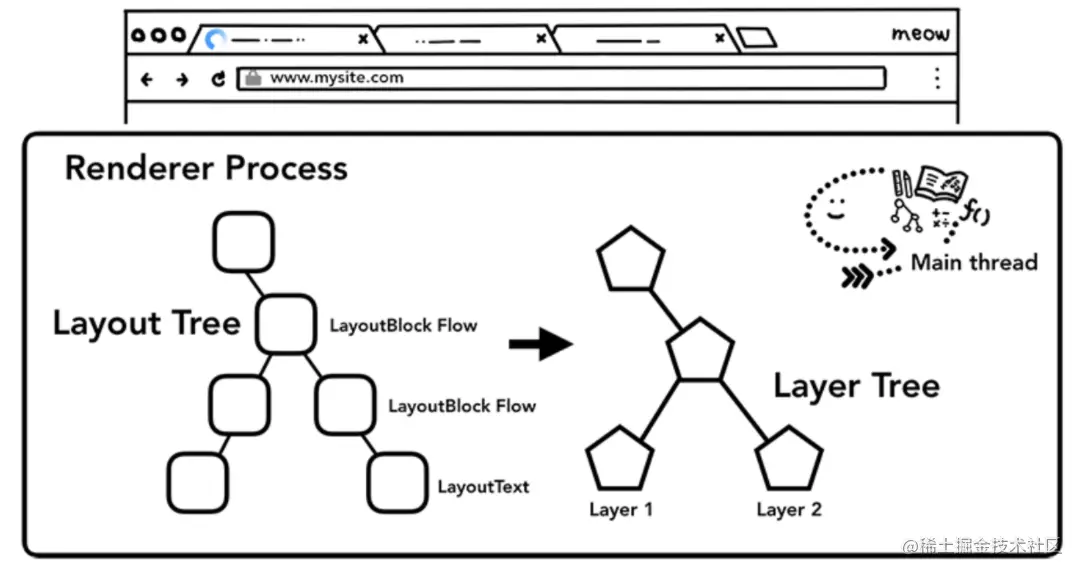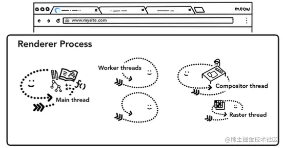 - 渲染器进程负责选项卡内发生的所有事情,在渲染进程中,主线程处理大部分代码