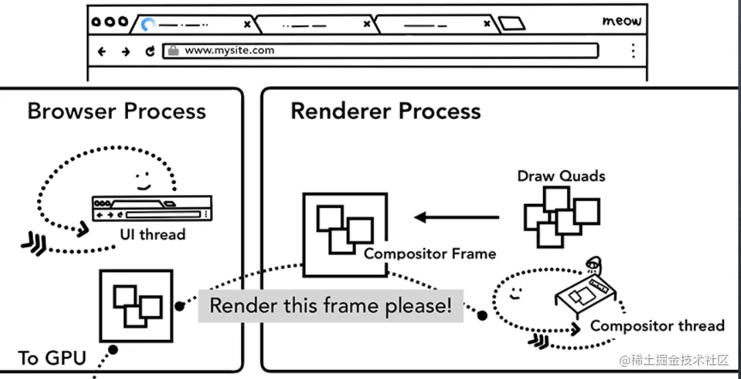 - 通过IPC将合成器帧提交给浏览器进程。这时可以从UI线程添加另 一个合成器帧以用于浏览器UI更改,或者从其他渲染器进程添加扩 充数据。 这些合成器帧被发送到GPU用来在屏幕上显示。如果发生滚动事件,合成器线程会创建另一个合成器帧并发送到GPU。
