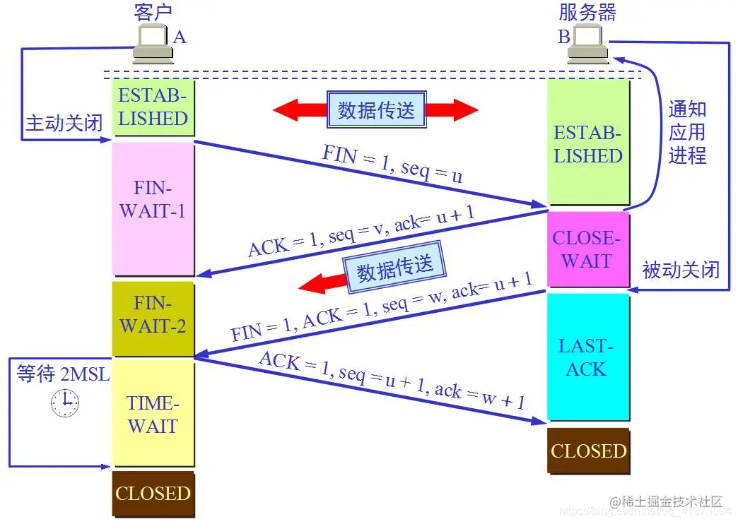 第四次挥手:客户端收到服务器的连接释放报文后,必须发出确认,ACK=1,ack=w+1,而自己的序列号是seq=u+1,此时,客户端就进入了TIME-WAIT(时间等待)状态。注意此时TCP连接还没有释放,必须经过2∗∗MSL(最长报文段寿命)的时间后,当客户端撤销相应的TCB后,才进入CLOSED状态。服务器只要收到了客户端发出的确认,立即进入CLOSED状态。同样,撤销TCB后,就结束了这次的TCP连接。可以看到,服务器结束TCP连接的时间要比客户端早一些。