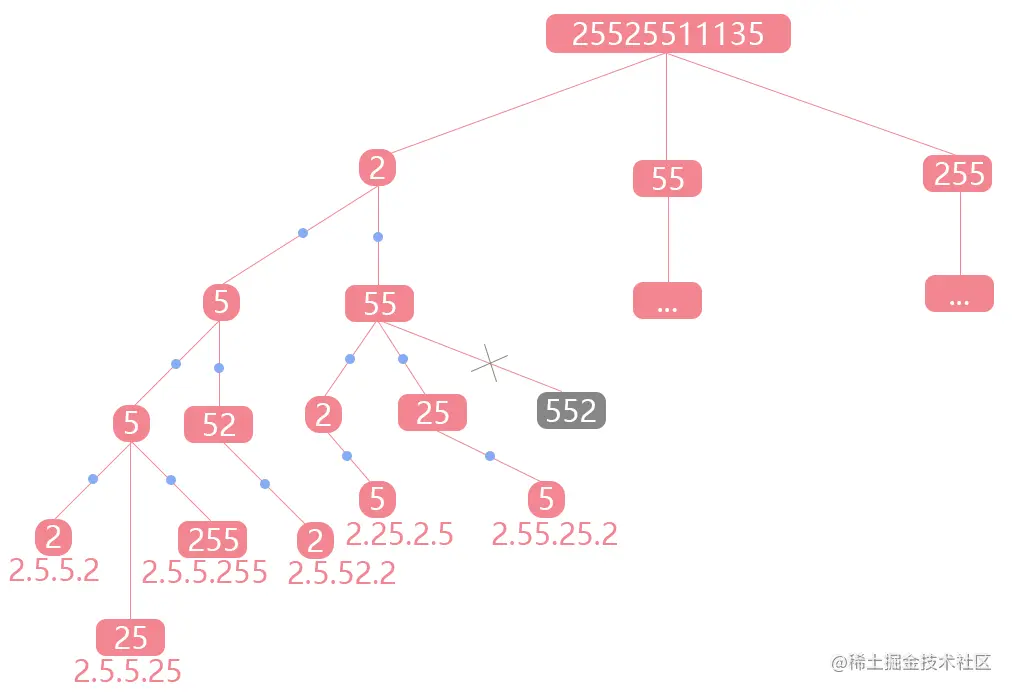 初始化传入三个变量,dot表示剩余的小数点,每层递归使用一个,为0时结束递归;第二个变量start,用于表示当前截取字符串的位置,只有截取到最后一位且没有小数点时,才能说是找到了一个合法的IP;第三个为空字符串,为初始化用于拼接的IP地址。
