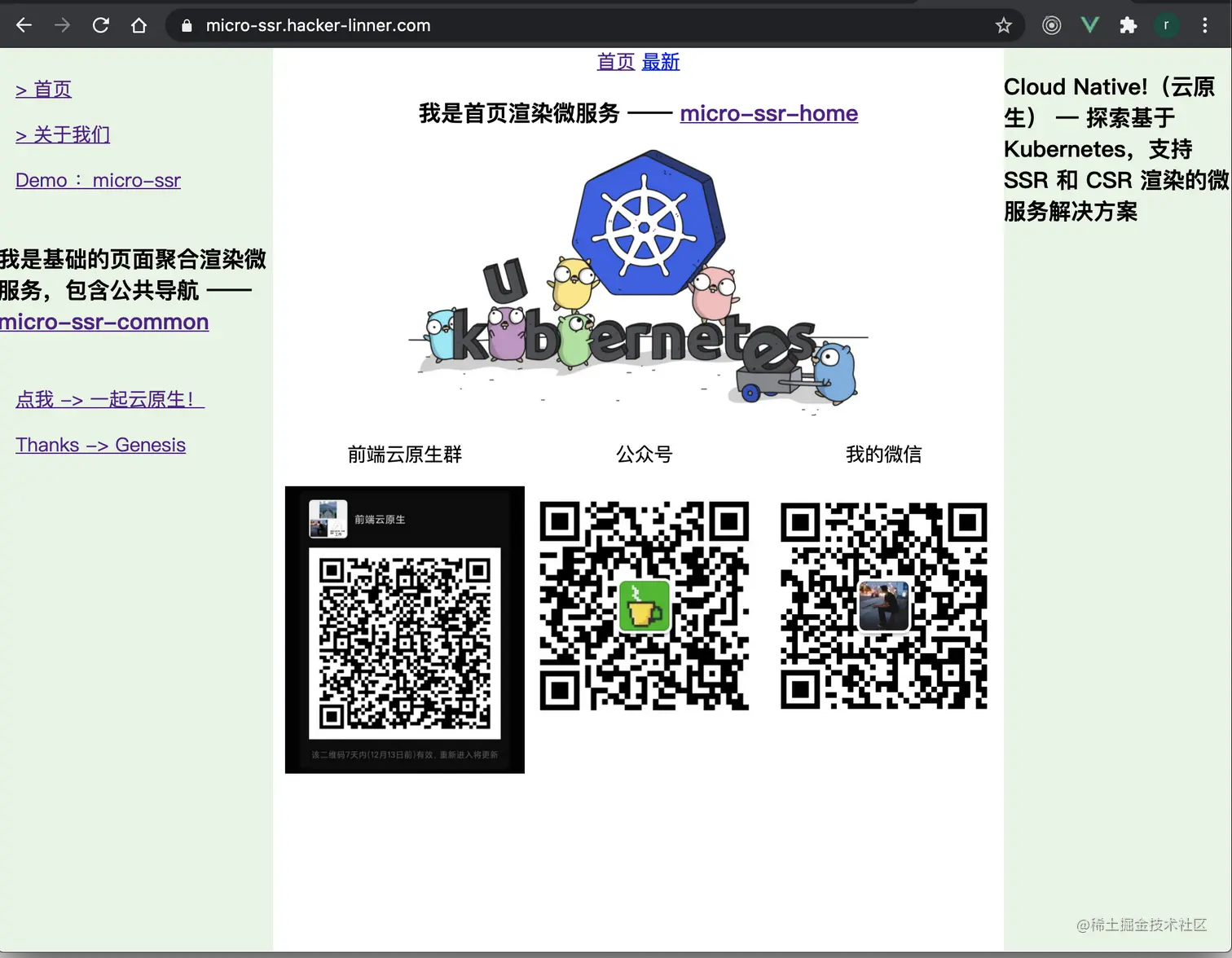 笔者在逛掘金的时候,有幸看到掘友狼族小狈开源的 genesis — 一个可以支持 SSR 和 CSR 渲染的微服务解决方案。总体来说思想不错,但是基于 Kubernetes 云原生部署方面一直没有完整的实践。所以笔者决定做个非官方的 Demo 供大家参考。