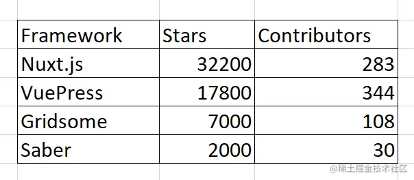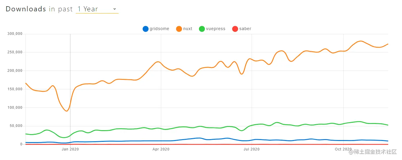 然而,当比较上述四个框架时,从 GitHub 和 npmtrends.com 统计数据来看,其中 Nuxt.js 和 VuePress 是佼佼者。