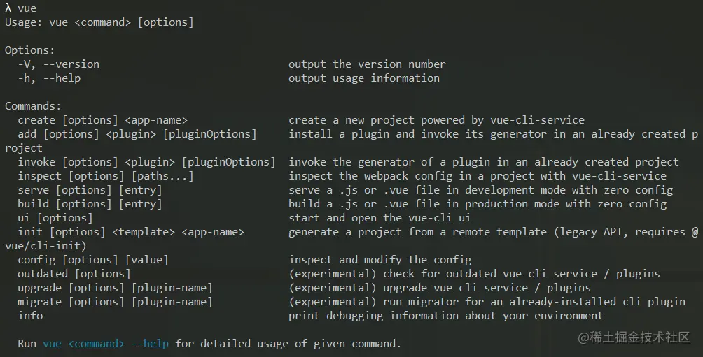 Vue-cli的提示,你可以通过这种方式看看vue-cli是否安装成功 - 这里的提示,也可以说是文档,可以让我们快速的了解怎么使用