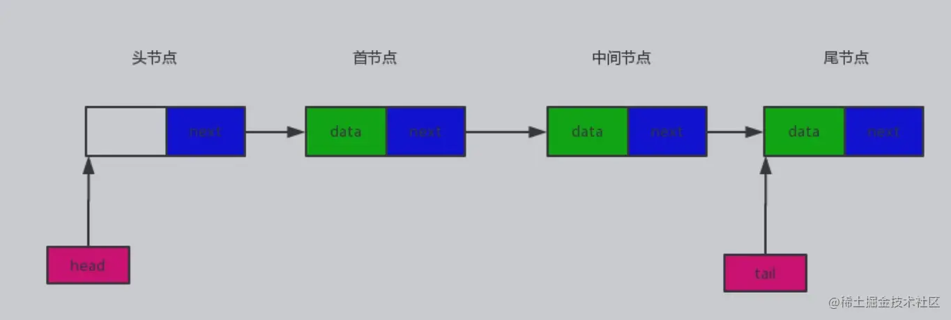 节点包含两部分,一部分是存储数据元素的数据域,一部分是存储指向下一个节点的指针域,上图,绿色是数据域,蓝色是指针域,他们一起共同构成一个节点。