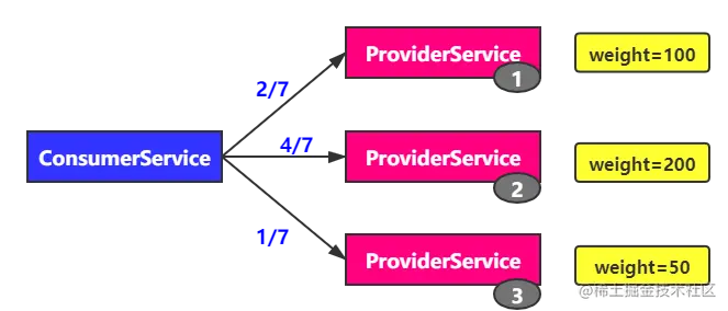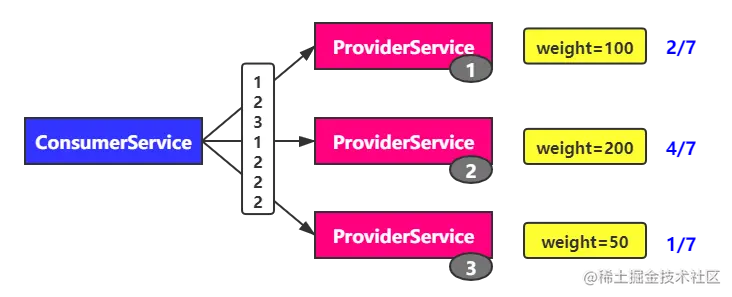 如果只考虑轮轮询的意思就是,比如访问 1 --> 2 --> 3,再一轮又是 1 --> 2 --> 3,但是如果还要基于权重,是这样的,比如第一次是 1 --> 2 --> 3 的顺序,然后第二轮 1 --> 2 ,当应该到 3 时候,按照这个权重比例,总共看成 7 份机会,1 和 2 调用了两次了,各自占据了 2份,但是 3 服务应该只能占据 1份,所以只能跳过3了,再第三轮,1 已经两份了,所以也不应该用了,所以考虑取去 2,所以这几轮的顺序就是 1 --> 2 --> 3 -->1 --> 2 --> 2 --> 2