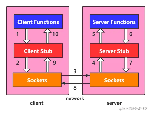 - ⑨ 客户端的 Client Stub 接收到服务端传来的结果消息,进行解码处理,即反序列化