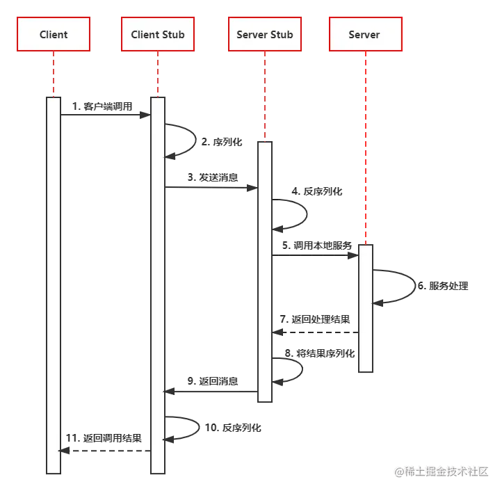 - ④ 服务端的 Server Stub,对收到的消息进行解码,也就是反序列化的过程