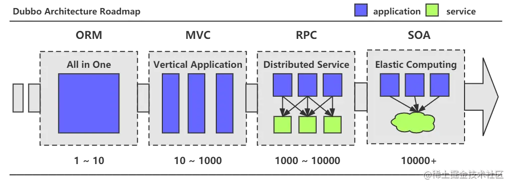 当垂直应用越来越多,应用之间交互不可避免,将核心业务抽取出来,作为独立的服务,逐渐形成稳定的服务中心,使前端应用能更快速的响应多变的市场需求。此时,用于提高业务复用及整合的分布式服务框架(RPC)是关键