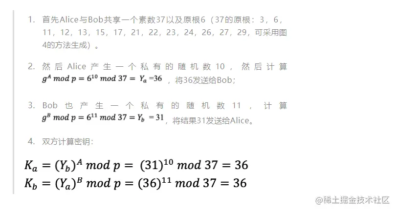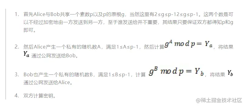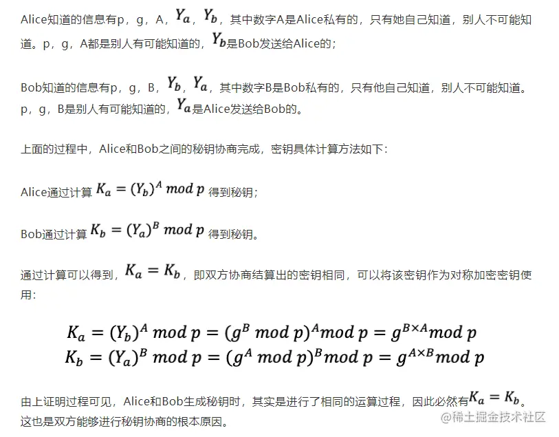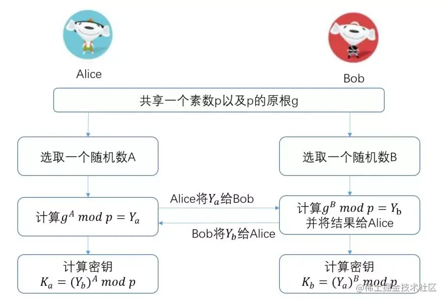和非对称加密算法的理论基础一样,DH算法也是基于一个数学难题,即计算离散对数的难度。具体来说,假设Alice需要与Bob需要协商一个秘钥,是这样一个过程: