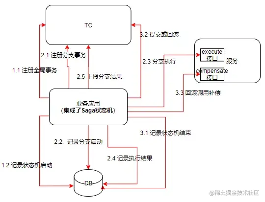 上图中对于多个分支事务,省略了多次出现的 2.* 步骤。对于全局事务执行过程中业务应用宕机情况,业务应用集群中对等节点会通过从TC获取相关会话,从DB加载详细信息来恢复状态机。