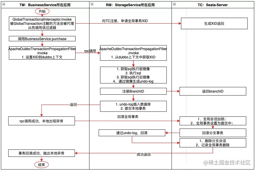 下图中,步骤1开启全局事务;步骤2注册分支事务,这里对应着一阶段;步骤3提交或者回滚分支事务,对应着二阶段。