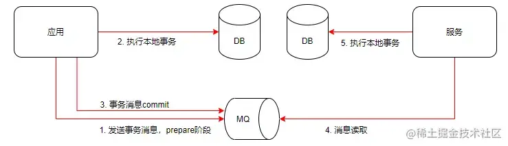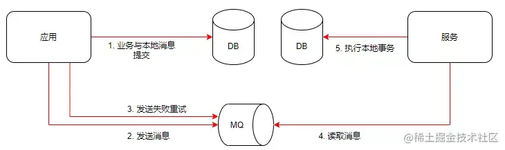 **本地消息表:**跟MQ事务消息类似,区别在于MQ不支持事务消息,需要借助本地数据库的事务管理能力。在步骤1中将需要发送的消息和本地事务一起提交到DB,借助DB的事务管理确保消息持久化。步骤2应用通过本地消息表扫描,重试发送,确保消息可以发送成功。