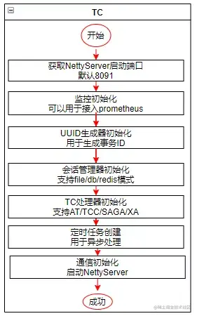 TC(事务协调器)以独立的服务启动,作为Server,维护全局事务和分支事务的状态,驱动全局事务提交或回滚。下面是TC的启动流程: