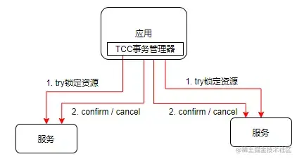 **TCC:**try/confirm/cancel,在try阶段锁定资源,confirm阶段进行提交,资源锁定失败执行cancel阶段释放资源。