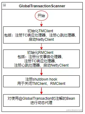TM所在应用中需要配置GlobalTransactionScannerbean,在应用启动时会进行如下初始化流程: