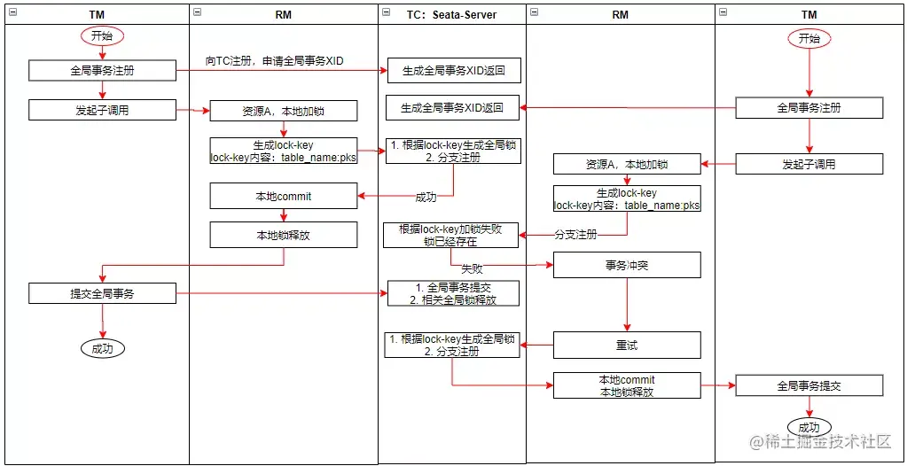 全局事务未提交,分支事务本地已经提交的情况下(假设修改了资源A),如何避免其他事务在此时修改资源A?Seata采用全局锁来实现,其流程如下: