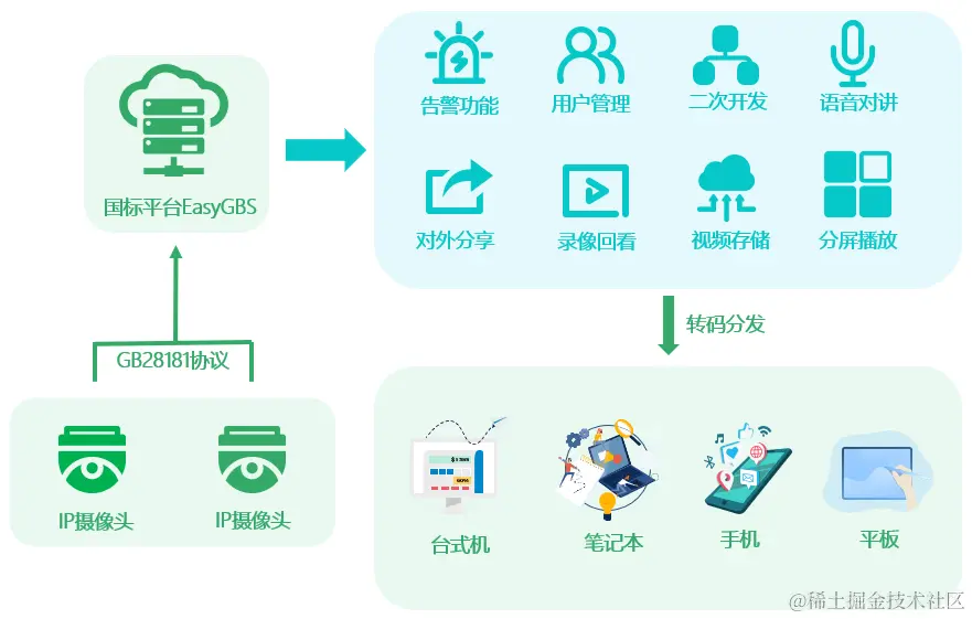 在大数据分析平台内,视频监控系统的重要性不言而喻,对于大多数大数据平台来说,视频分析已经成为了必不可少的一项内容。视频监控系统从收集到分析的流程架构为:采集-存储-展示-告警这四大块,目前TSINGSEE青犀视频开发的国标GB28181协议视频智能分析平台EasyGBS已经兼容这四大块的内容处理,能够为大数据平台的搭建提供视频能力上的支持。