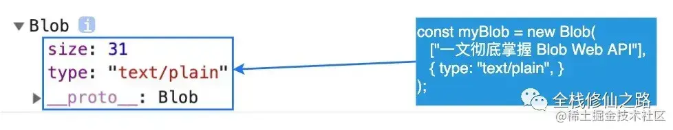如你所见,myBlob 对象含有两个属性:size 和 type。其中 size 属性用于表示数据的大小(以字节为单位),type 是 MIME 类型的字符串。Blob 表示的不一定是 JavaScript 原生格式的数据。比如 File 接口基于 Blob,继承了 blob 的功能并将其扩展使其支持用户系统上的文件。