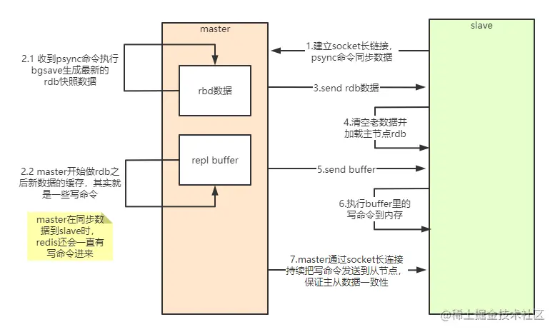 如果你为master配置了一个slave,不管这个slave是否是第一次连接上master,都会发送一个psync命令给master请求复制数据,master接受到该命令后,会在自己的后台进行数据持久化通过bgsave生成最新的rdb快照文件(持久化期间,master会继续接受客户端的请求,它会把这些可能修改的数据集的请求缓存在内存中,redis.conf配置中有个repl-backlog-size 1mb),当持久化完成后会master会将这份最新的rdb数据发送给slave,slave会把接收到的数据进行持久化生成rdb,然后再加载到内存中,然后,master再将之前缓存在内存中的命令发送给slave,实现全量备份。