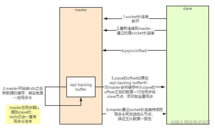 Redis2.8版本以后,可以支持部分数据复制psync去master同步数据,slave和master都维护了复制的数据的下标offset和master的进程id,因此,当网络中断重连后,slave会请求master继续进行未完成的复制,从所记录的offset开始,如果master进程id变化了,或者从节点数据下标offset太旧,已经不在master的缓存队列里了,那么就会进行一次全量复制。